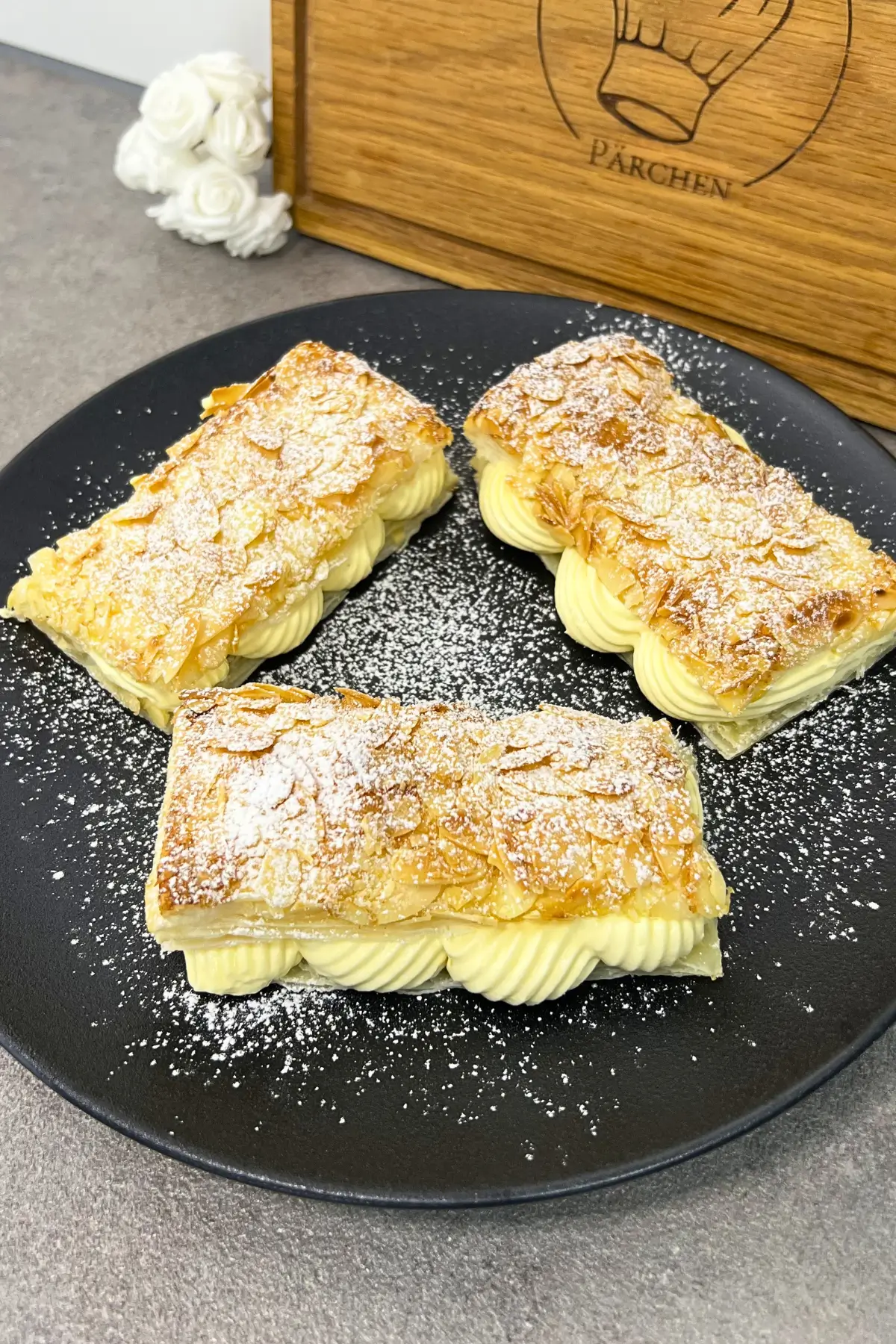 - Die Kombination aus knusprig und cremig ist unschlagbar: Einer der größten Gründe, warum dieses Rezept so begeistert, ist der perfekte Kontrast zwischen dem knusprigen Blätterteig und der weichen Vanillecreme. Außen goldbraun, leicht blättrig und knackig. Innen weich, cremig und luftig. Genau diese Mischung macht jeden Bissen besonders.