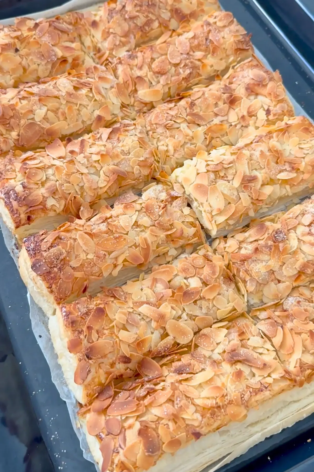 Besonders schön finde ich, dass dieses Rezept nicht nur unglaublich lecker schmeckt, sondern auch optisch richtig etwas hermacht. Die goldbraun gebackenen Mandelblättchen glänzen leicht karamellisiert auf dem Blätterteig, die Creme ist samtig weich und beim ersten Anblick sieht man sofort diese wunderschöne Füllung. Es ist eines dieser Rezepte, bei denen jeder automatisch fragt: „Hast du die wirklich selbst gemacht?“