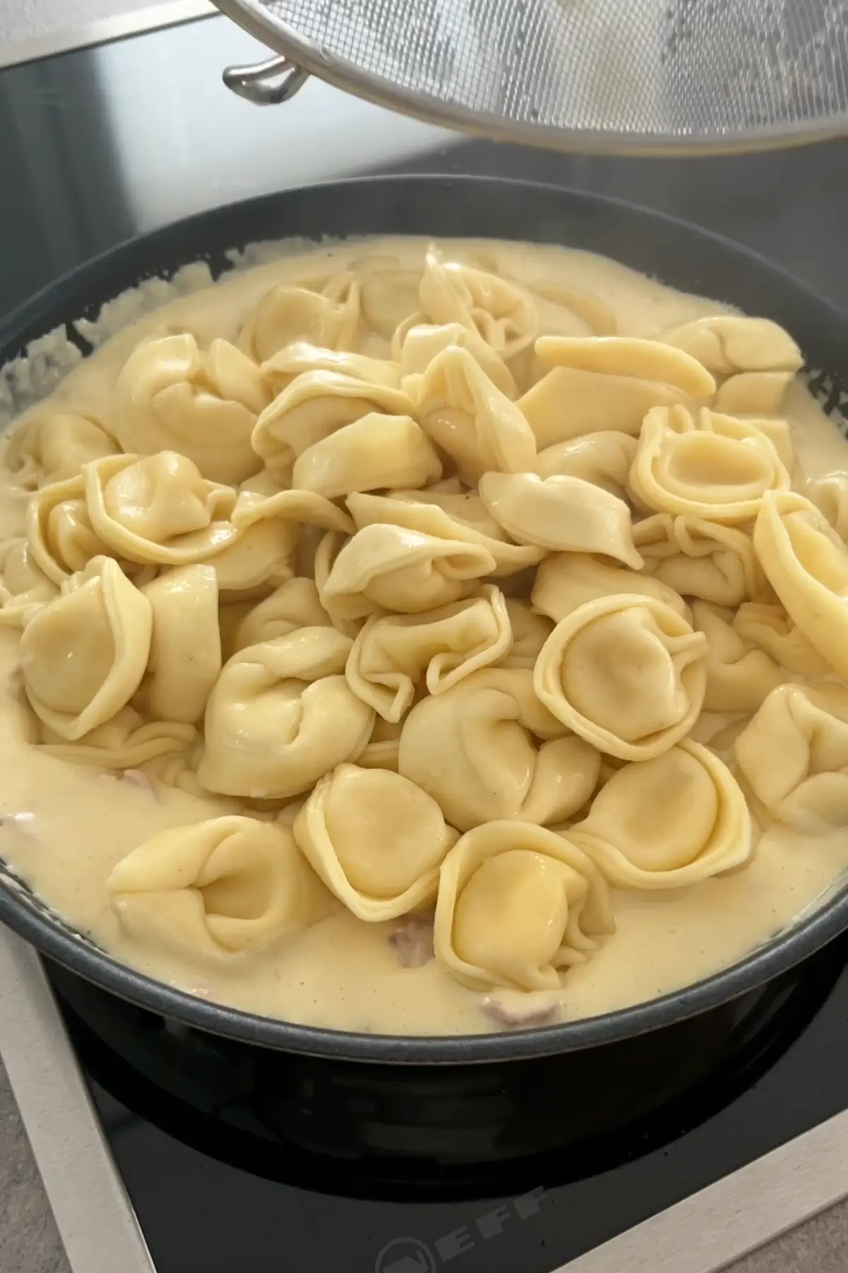 - Mit ca. 1/3 der Sahne und einem Schuss Tortellini-Nudelwasser abgießen.