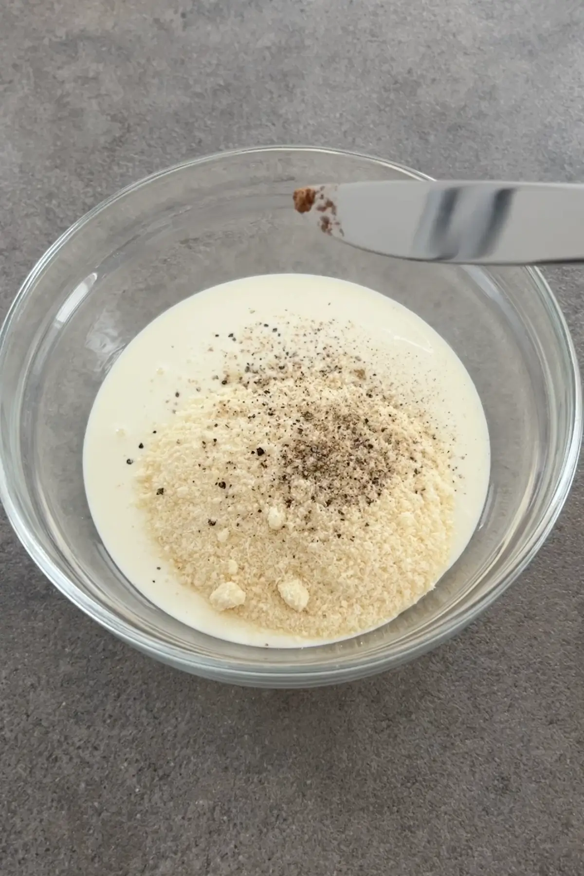 - Die restliche Sahne, mit den Eigelbe und dem Parmesan in eine Schüssel geben, mit Salz und Pfeffer sowie Muskatnuss würzen und gut vermengen. Die Soße ebenfalls in die Pfanne geben und auf schwacher Hitze kurz köcheln lassen.