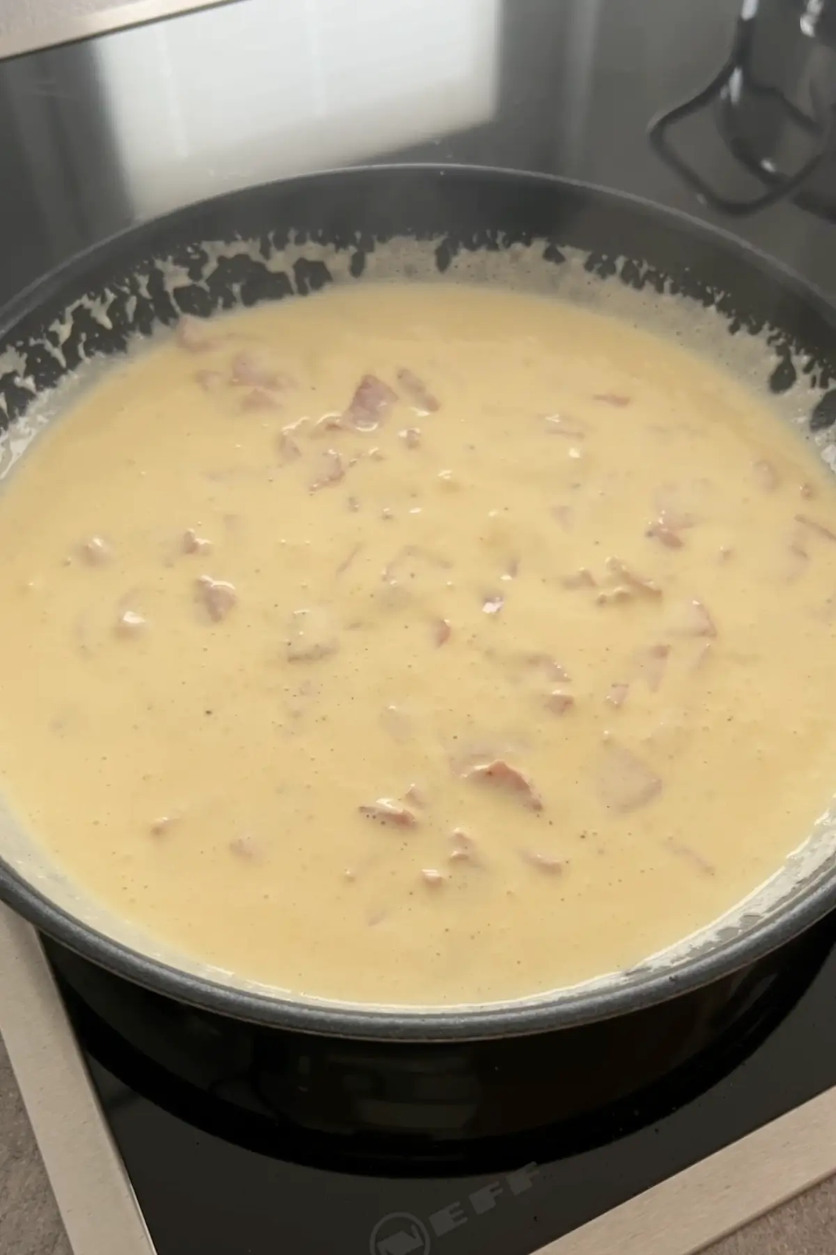 Sahne: Sahne ist der ultimative Geschmacksträger. Fett transportiert Aromen und in diesem Fall sorgt sie für diese unvergleichliche Samtigkeit. Sie verbindet die Schärfe des Knoblauchs mit der Würze des Schinkens und schafft eine homogene Basis, die alles zusammenhält.